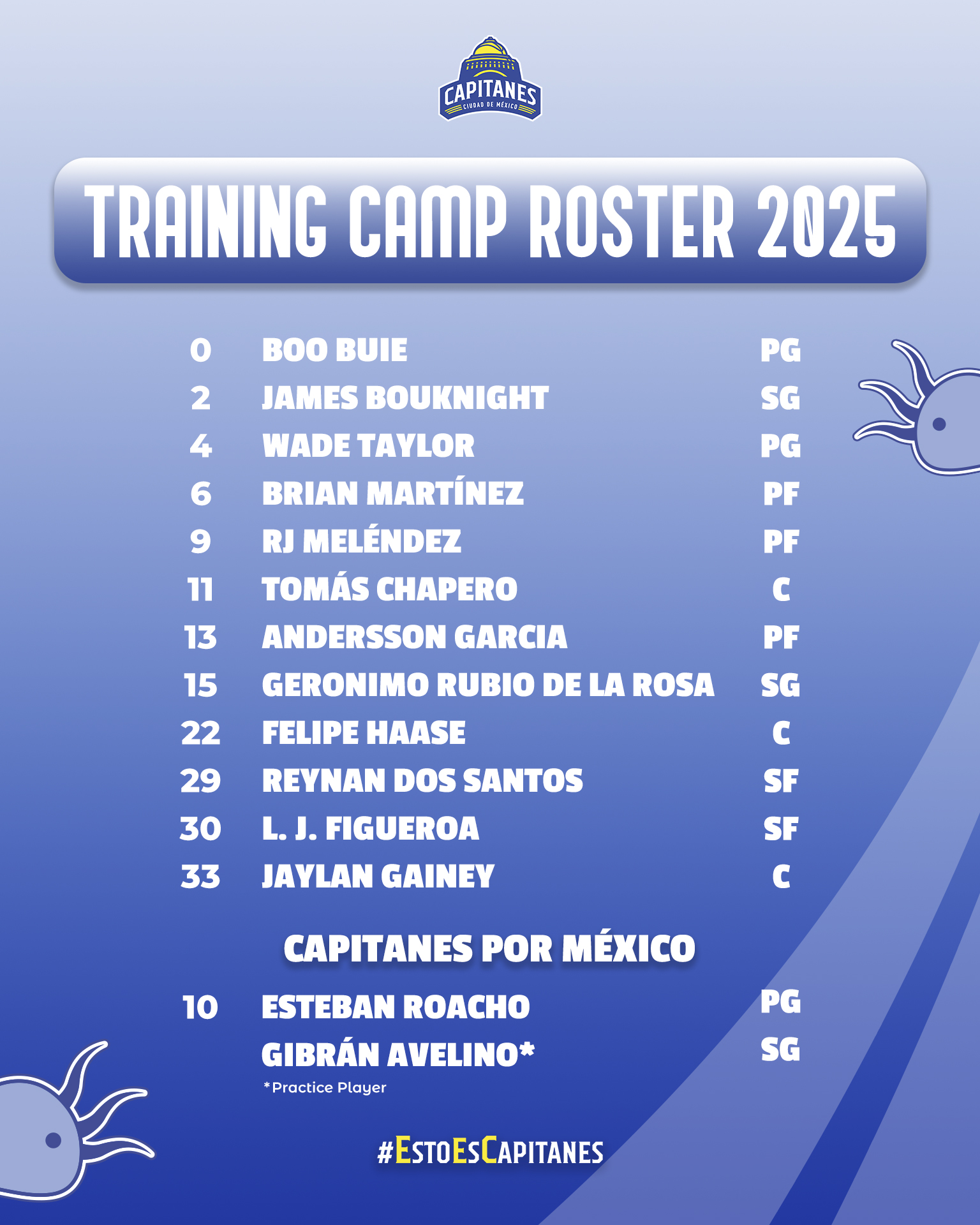 El roster para el training camp que llevan a cabo en la Ciudad de México, nos presenta un grupo con mucha influencia latina, comenzando por el coach brasileño, Vitor Galvani, además de contar con jugadores originarios de República Dominicana, Argentina, Chile, Brasil y por supuesto, México, representado por los jóvenes Esteban Roacho y Gibran Avelino quienes buscarán ganarse un sitio en el equipo.