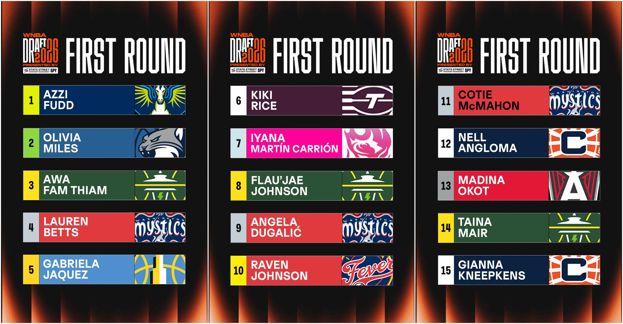 Además, destaca la presencia de tres jugadoras españolas, encabezadas por Awa Fam seleccionada en la posición 3 por Seattle Storm, además de Iyana Martín selección número 7 por Portland y Marta Suárez elegida en la posición 16.